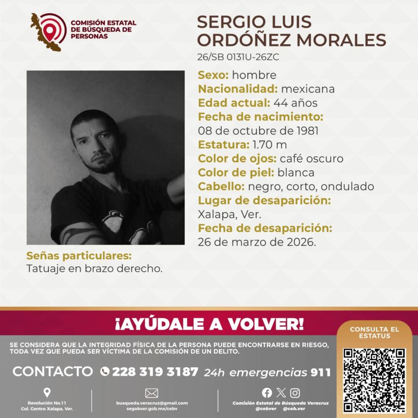 Xalapa, Ver., 7 de abril de 2026.— La Comisión Estatal de Búsqueda de Veracruz (CEBV) activó la ficha de localización de Sergio Luis Ordóñez Morales, músico y taxista de Xalapa, reportado como desaparecido desde el pasado 26 de marzo de 2026. La solicitud de apoyo ciudadano se difundió de manera oficial y en redes sociales, ante la falta de información sobre su paradero.
