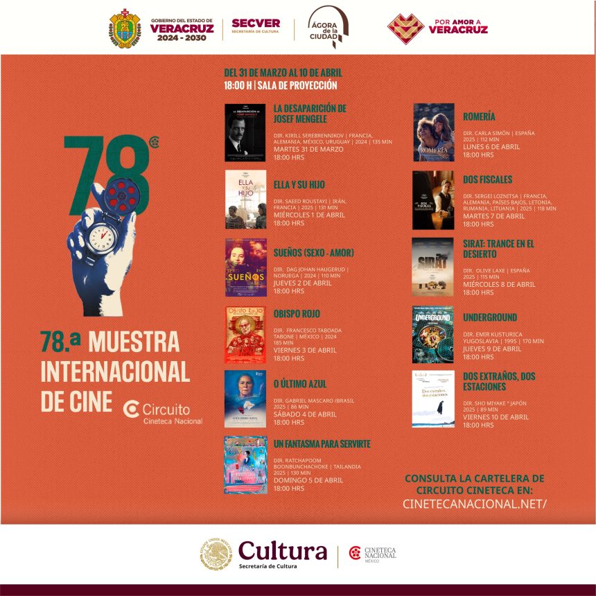 Xalapa, Ver., 31 de marzo de 2026.— La Secretaría de Cultura de Veracruz (SECVER) inauguró este martes la 78.ª Muestra Internacional de Cine de la Cineteca Nacional en el Ágora de la Ciudad, donde se proyectarán 11 películas de distintas partes del mundo hasta el 10 de abril, con funciones diarias a las 17:00 horas y entrada libre.
